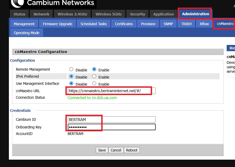 After logging into the router click on Administration and then cnMaestro. If you do not see a message in Connection Status saying “Connected…” in green then you will want to add the following to the page and then click Save.
