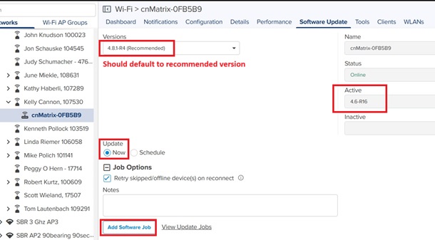 You should only update the firmware when their connection is otherwise stable. To update the firmware select the Software Update tab. The version should default to 4.8.1-R4 and you can then select “Add Software Job”