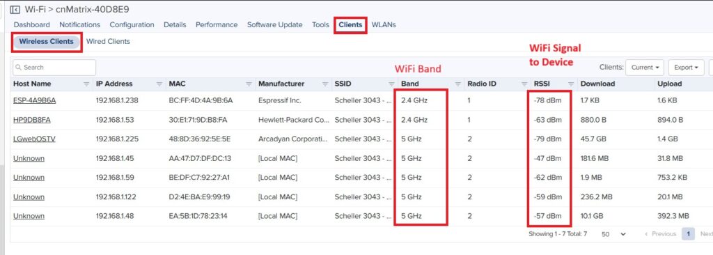 To check the strength of the WiFi signal to a given device you can click on the “Clients” tab. It will default to the Wireless Clients. You can see which band (2.4 or 5GHz) a device is connecting to under band. The signal strength to the device is shown in RSSI. A signal of -70 or better is excellent. -70 to -75 is usually decent and as the signal gets closer to -90 it worsens to the point where it won’t maintain a connection.