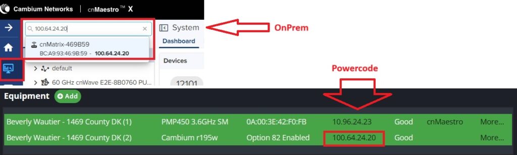 You can search for the router by clicking on the “Monitor” icon on the left side and typing the IP address of the router from Powercode into the search field. The select the router from the drop-down menu (it will either begin with cnMatrix or cnPilot followed by the last 6 digits of the MAC address). Depending on the type of radio it may appear underneath their radio.