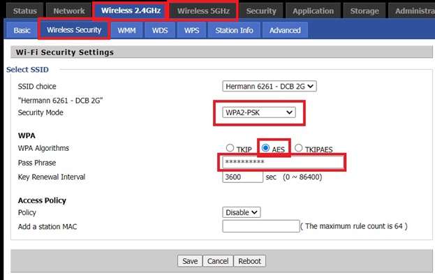 On Cambium routers (like Readynet or Mercury) there are separate tabs for both the 2.4 and 5GHz WiFi networks. Therefore when changing the wifi name or password you need to make changes to both of the tabs. We usually differentiate between the 2.4 and 5Ghz wifi by using “- 2G” and “-5G” at the end of the wifi name. After making the change click “Save” and “Reboot”.