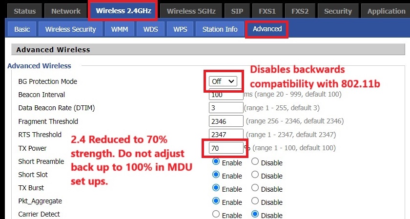Our default configuration for the Cambium routers reduces the 2.4 WiFi signal to 70% of the max in order to reduce interference (shown below). We also disable backward compatibility with 802.11b (pre-2007 wifi devices) for the same reason. We do not make similar changes to the 5GHz Wifi.