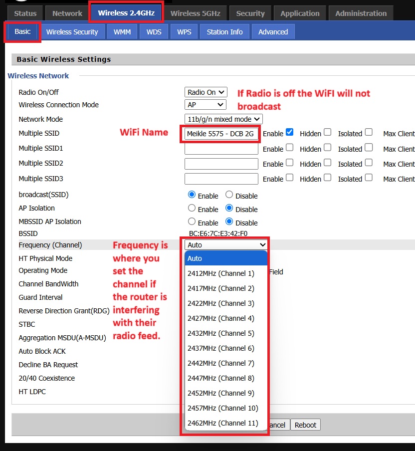 If the customer is getting their internet via a 2.4 radio and you see evidence that their router’s WiFi is interfering with their feed you can change the Frequency that the wifi is operating on from auto to a specific channel.