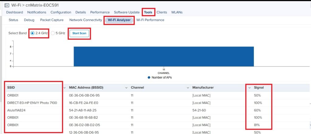 It is sometimes necessary to do a WiFi scan to look for evidence of interference or undisclosed wireless extenders or access points. To perform a WiFi Scan click the Tools tab and then select the band you wish to scan (usually 2.4) and click “Start Scan”.