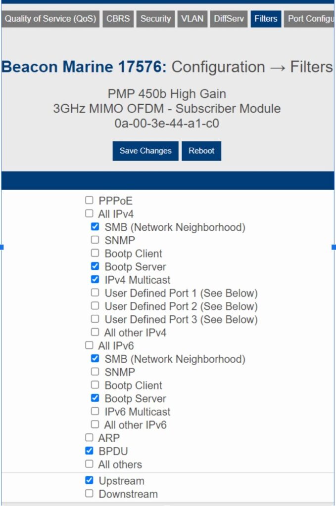 The filter settings below are the correct settings to permit Option 82 to work on DCB. For Bertram PMP 450 customers on Option 82 sites, the filters don’t need to be identical but if the customer is experiencing issues, setting up the filters like below is recommended. These settings will only show up if the radio is bridged – if the radio is NATted you will have to switch it to bridged mode in the NAT settings and reboot it (these filters won’t appear until after the reboot). After saving the changes you will need to reboot the radio.