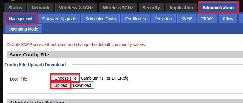 After logging into the router click on “Administration”, “Management”, “Choose File”, and select the configuration file and click Upload. You should get a message indicating “The file has been successfully imported!” and you can then reload the router’s login page and login with admin/PassPass and continue setting up the WiFi. Make sure to grab the correct