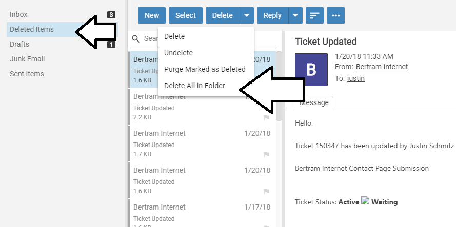 There are two options here; going into the user’s account yourself and deleting spam emails, or guiding the user through doing it themselves. Regardless of which path you choose, follow the steps below for deleting email.