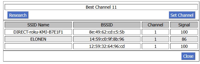It is sometimes necessary to do a WiFi scan to look for evidence of interference from neighboring routers or access points. To perform a Channel Scan click the Channel scan on the appropriate tab (2.4 or 5). This will scan to show any neighboring WiFi networks it can see – including from wireless extenders – which might contribute to localized interference.