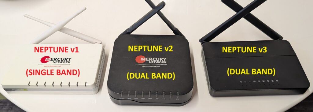 There are 3 versions of Neptune routers. V1 is a single band router. Despite being white and looking like DCB’s dual-band Readynet AC1000 it only broadcasts a 2.4 GHz signal. The Neptune v2 & v3 are dual band routers. The v2, which is more square looks like the DCB Readynet AC1200 routers and the v3 looks like DCB’s Cambium routers.