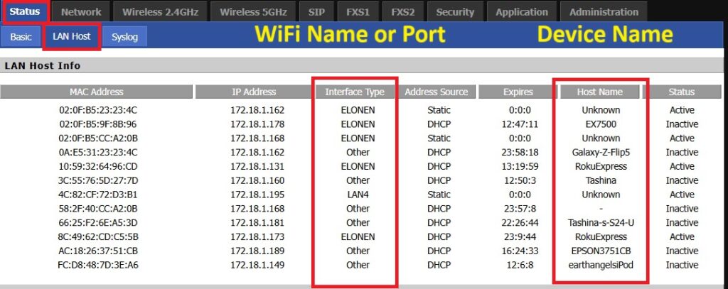 If you click on LAN Host under Interface Type you will see the connected devices and whether they are connected to the wifi or are hardwired to a LAN port. On the right side you will see the Device Name which can be useful for determining what the device is you are looking at. If it is not obvious what the device is you can look up the MAC address using the Wireshark OUI lookup tool.
