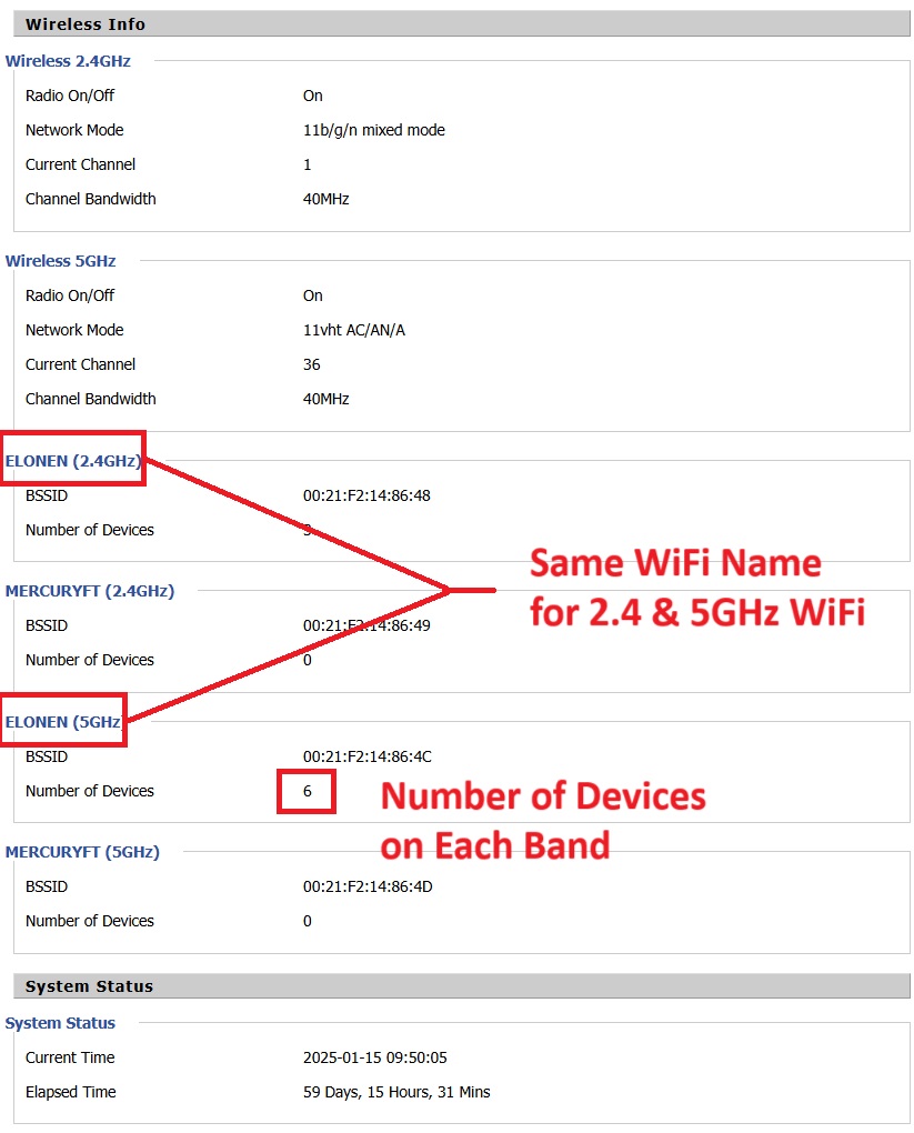 At the bottom of the main page you will see information about the WiFi including the SSID, the number of devices connected to each wifi network and the current channel each of the wifi networks are operating on. Unlike, DCB or XL routers, Mercury routers were set up with the same SSID for both the 2.4 and 5GHz WiFi. If needed you can rename the SSIDs to permit customers to select one over the other (see below). It is usually recommended that you leave the 2G alone and just add a “-5G” to the end of the 5GHz SSID to ensure existing devices remain connected to at least one of the networks.