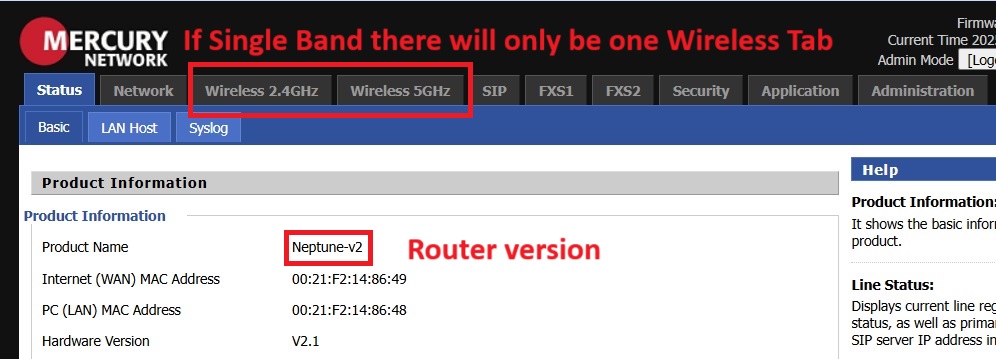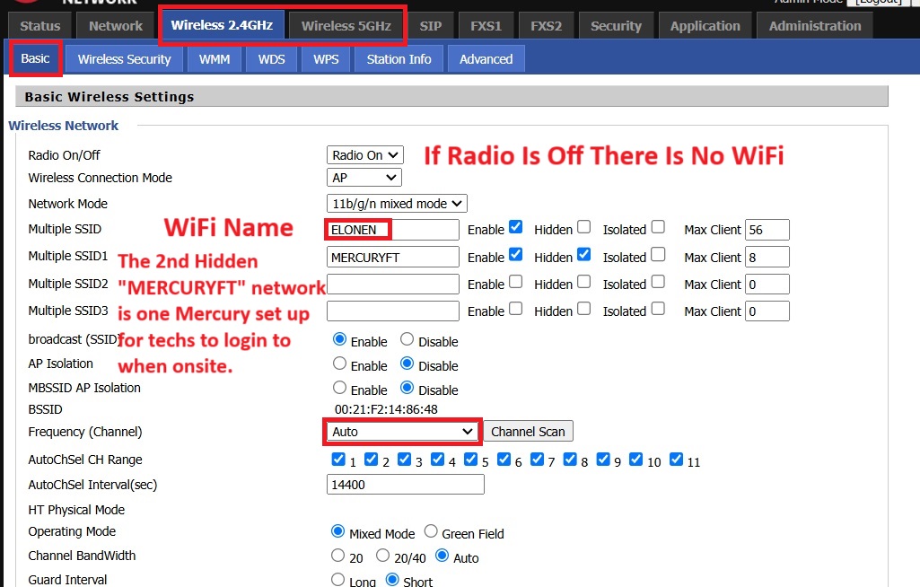 On Neptune routers that are dual band there are separate tabs for the 2.4 and 5GHz wifi networks. Therefore, when changing the WiFi name or password you need to make changes to both of the tabs. Mercury did not reduce the channel widths to 20MHz like DCB, but if you do see evidence of interference you can reduce the channel width to 20. There is a hidden “MERCURYFT” network that Mercury installers used to connect to routers. Bertram does not use this.