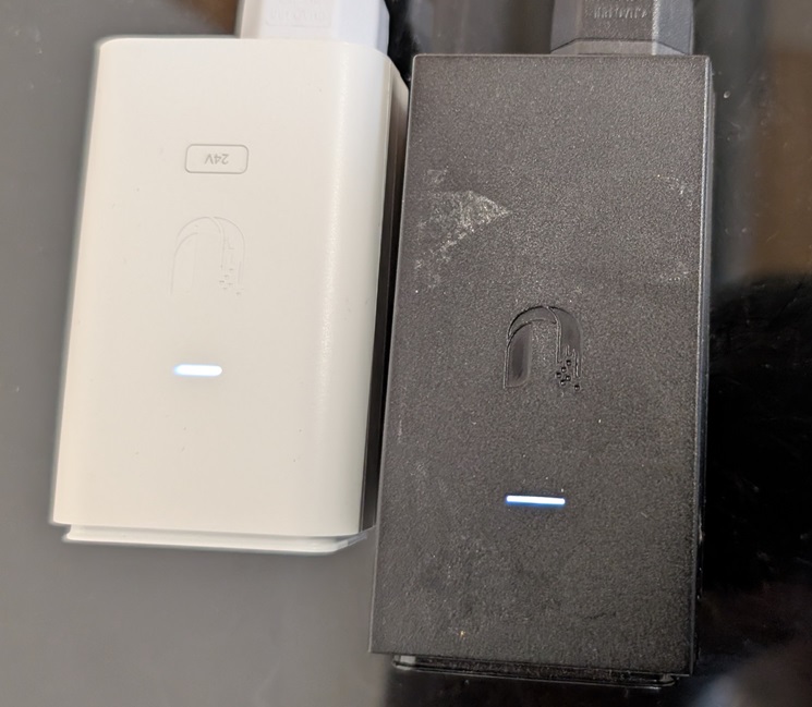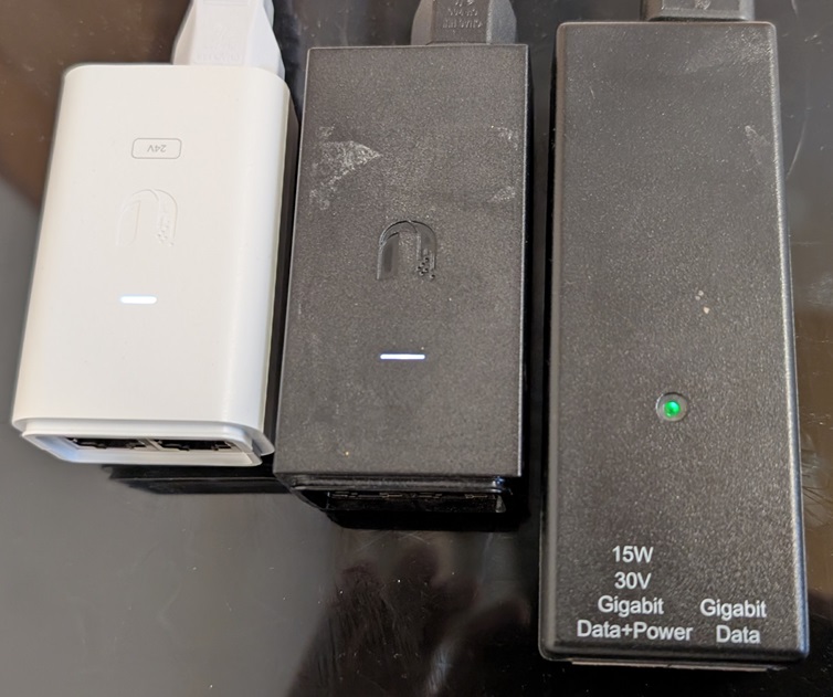 Most XL customers will have the white Ubiquiti (UBNT) PoE injector shown on the left side. Some will have the black version of the UBNT PoE in the middle. On the handful of sites that have Cambium APs they will have some version of the Cambium PoE injector on the right side.