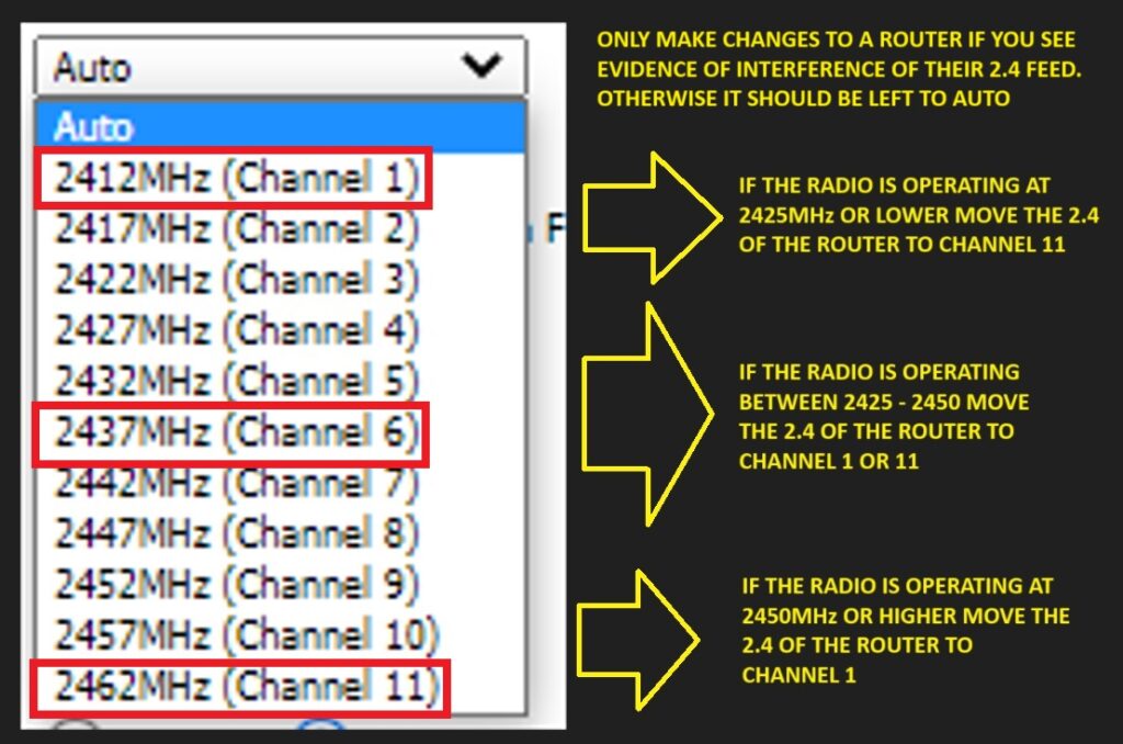 If the customer is getting their internet via a 2.4 radio and you see evidence that their router’s WiFi is interfering with their feed you can change the Frequency that the WiFi is operating on from auto to a specific channel. Use the chart below to determine what channel to move it to.