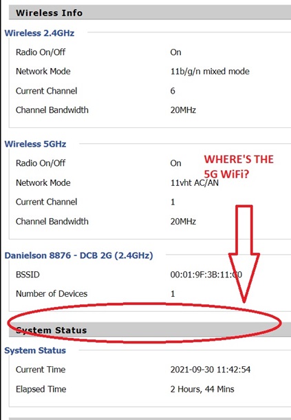 Here is an example, below, of when the 5GHz wifi is missing on the router. As noted above, if they are on old firmware this glitch can usually be resolved by updating it.