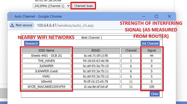 It is sometimes necessary to do a WiFi scan to look for evidence of interference from neighboring routers or access points. Especially in MDU (Multi-Dwelling Unit) situations such as apartment complexes or condominiums this interference can be considerable and is why we especially recommend connecting to 5GHz WiFi. To perform a 2.4 WiFI Scan on a Readynet router select “Channel Scan” from the Wireless 2.4 GHz tab. This will perform a scan to show any neighboring 2.4 WiFi networks it can see – including from wireless extenders – which might contribute to localized interference. You can do the same with 5GHz on that tab but it is usually not necessary.