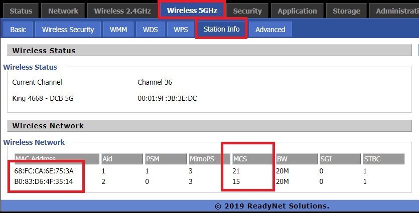 As MCS levels get closer to 0 the signal is worse. For the Readynet routers, if the MCS level of a given device shows a 0-5 the signal is likely poor. If the device is connected to the 5Ghz at that low of an MCS level it may be beneficial to move it to the 2G to see if it improves. 6-11 will generally be okay and a higher value than 11 (for example 15) usually should indicate a relatively strong signal and data rate. In the example above both devices are showing a strong data rate of 21 and 15, respectively. A table of 802.11ac HT MCS data rates is available here.