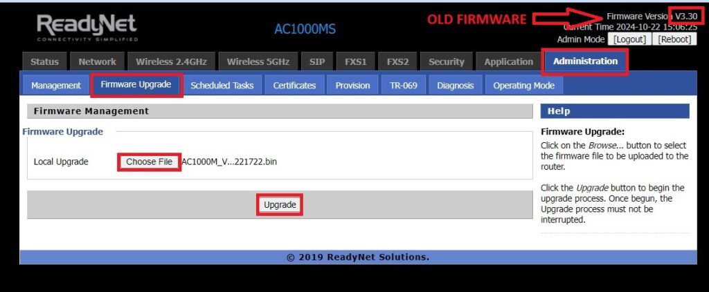 If a Readynet router is on old firmware then it should be updated as long as the connection is stable. You can download the latest firmware for the Readynet AC1000 from here. Grab the most recent 09/22/20 v3.32 firmware to your computer. Then click on the Administration tab, followed by the Firmware Upgrade tab. Choose the file and click “Upgrade”
