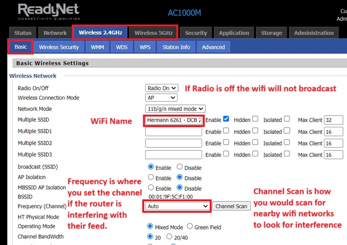 On Readynet routers there are separate tabs for both the 2.4 and 5GHz wifi networks (this is identical to Cambium routers or Neptune routers on Bertram). Therefore when changing the wifi name or password you need to make changes to both of the tabs. We do use 20MHz channel widths on our managed routers to reduce the potential for interference.