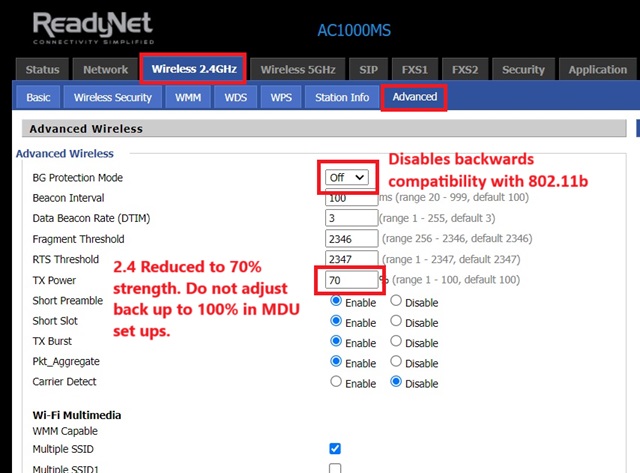Our default configuration for the Readynet routers in MDUs reduces the 2.4 WiFi signal to 70% of the max in order to reduce interference (shown below). We also disable backwards compatibility with 802.11b (pre-2007 wifi devices) for the same reason. We do not make similar changes to the 5GHz Wifi.