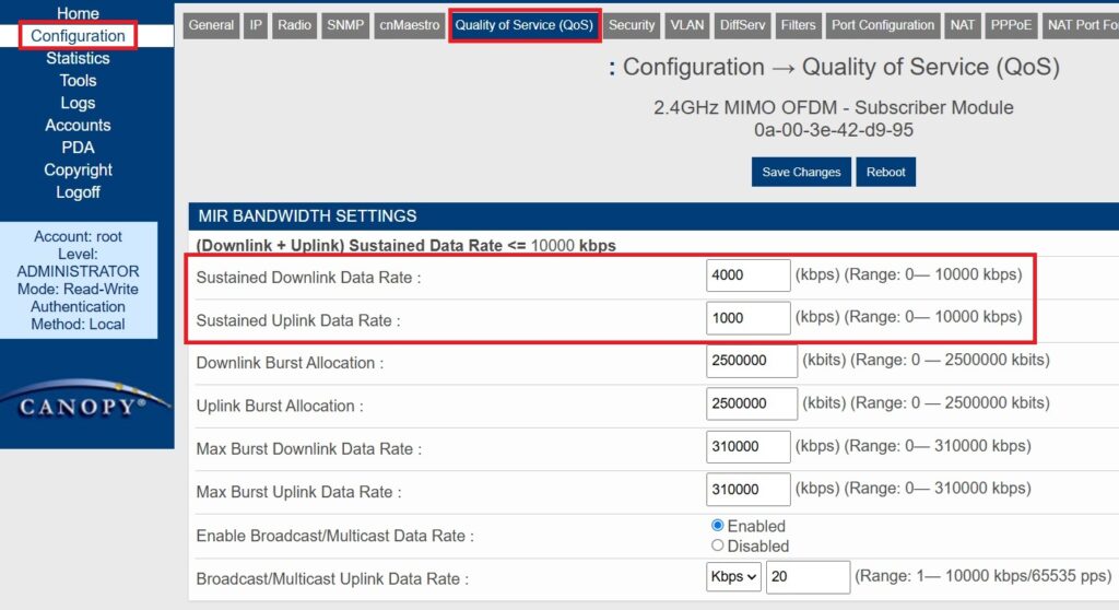 After the plan is changed Powercode is supposed to update the QoS settings and reboot the PMP450 radios, however certain settings (such as read-only SNMP permissions) can prevent the radio’s QoS from updating and permitting them to make use of the faster speeds. After upgrading the plan you should check the radio’s QoS by selecting Configuration->QoS. The sustained Downlink & Uplink Data Rates should be set to their new plan speeds. When doing so keep in mind that it is measuring in kbps so a 15mbps down, 5 mbps up plan should reflect 15000 down by 5000 up. Depending on the model of radio the order of the two could be reversed. If you end up needing to update the QoS settings, then Save and Reboot the radio.