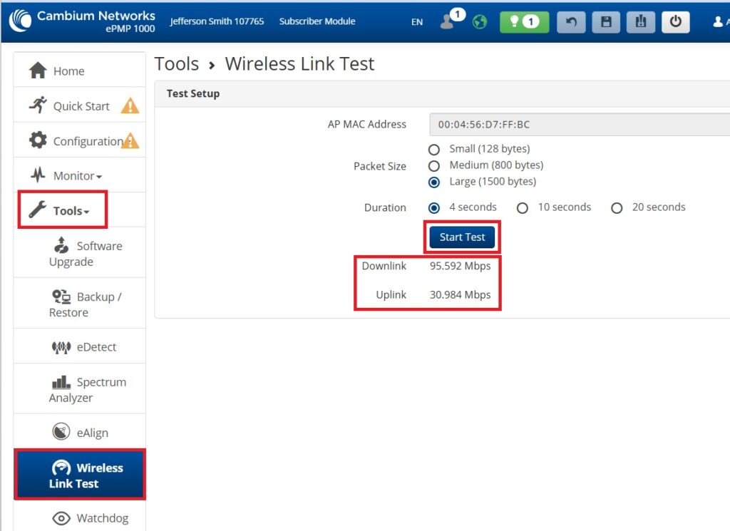 For ePMP radios you would click on Tools -> Wireless Link Tests and then Start Test. Again, divide the results in half to get the available plan speeds.
